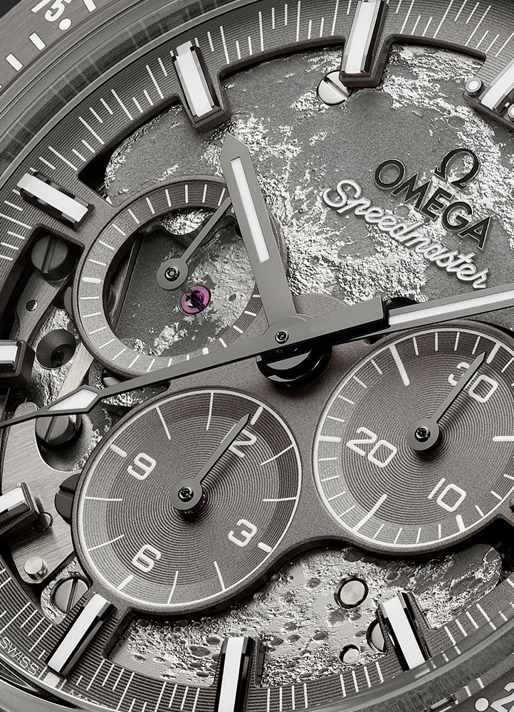 Incluso las esferas son una proeza de la microingeniería. Construidas en dos capas, la placa superior presenta acabados cepillados con láser que reflejan la luz como el polvo lunar, mientras que la capa inferior añade contraste dimensional, junto con escalas taquimétricas y coronas en Liquidmetal™ para mejorar la durabilidad y la precisión de los bordes.