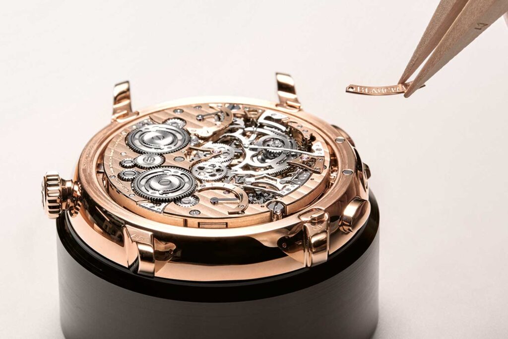 El ensamblaje toma casi un año. El movimiento se construye una vez para pruebas, luego se desmonta por completo, se limpia y se vuelve a montar. Al final de este proceso, una pequeña placa de oro se atornilla en el movimiento: en un lado, la firma de Blancpain, en el otro (visible solo para un futuro relojero), el nombre grabado de la persona que lo construyó.