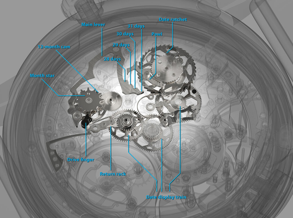 -Calendario perpetuo retrograde completamente integrado, con un sistema corrector bajo la asa rediseñado dentro del movimiento. Estos tres correctores no requieren herramientas y aseguran un ajuste sin esfuerzo e intuitivo