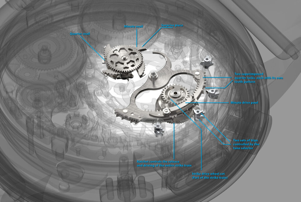 Detrás de esto, un selector vinculado a la caja controla una leva que define las tres posiciones: gran sonería, pequeña sonería y silencio. Una estrella de cuatro dientes montada en el piñón de cañón libera el mecanismo en cada cuarto, levantando la palanca principal que acciona las cremalleras. En gran sonería, la leva permite que la cremallera de horas lea la leva de horas cada vez que la estrella activa una liberación, por lo que las horas siempre se repiten antes de la melodía del cuarto. En pequeña sonería, una palanca dedicada bloquea la cremallera de horas en los cuartos pero la deja libre en la hora en punto; una leva de horas en la misma estrella levanta esta palanca en la hora en punto, permitiendo que la cremallera de horas caiga y repique la hora una vez antes de la melodía. En modo silencio, una palanca de silenciado levanta el trinquete principal lejos del mecanismo de trinquete, el corazón de la impulsión de la sonería, por lo que se desactiva todo repique de paso, mientras que una ruta separada mantiene la repetición de minutos disponible siempre que haya suficiente energía en el barril de la sonería. Pero, en última instancia, el evento principal es la capacidad de cambiar entre dos melodías diferentes.