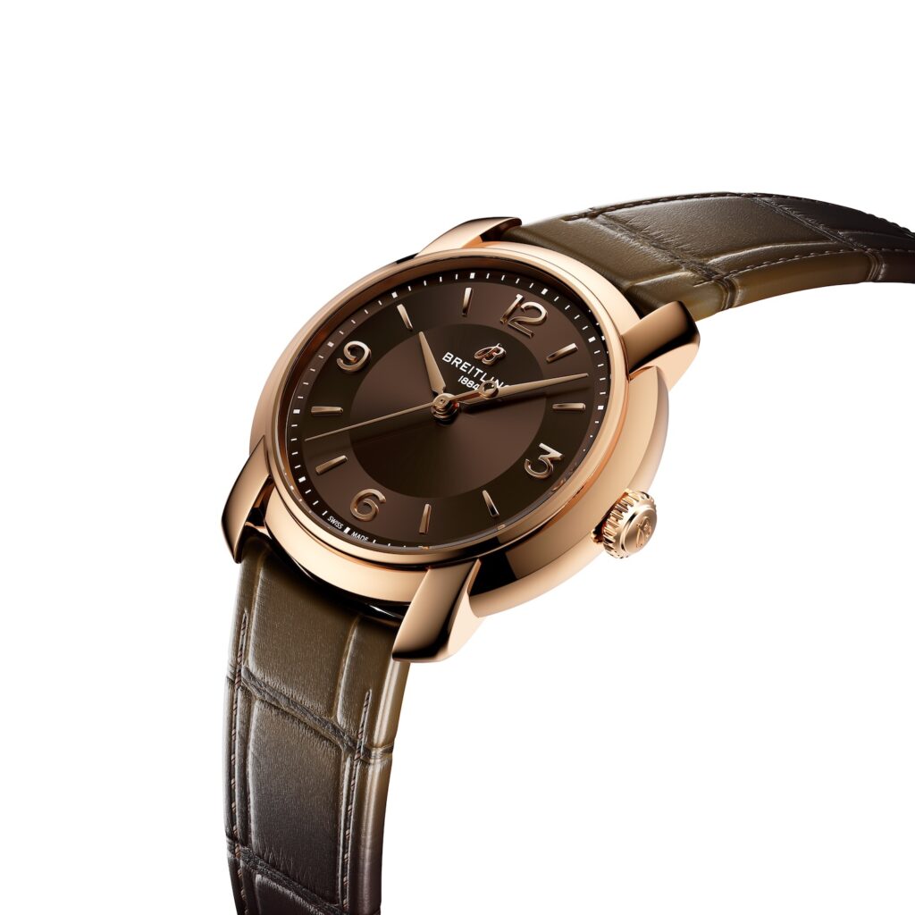 Los modelos automáticos de 36 mm, en acero inoxidable, incluyen esferas en tonos vibrantes y correas de cocodrilo con degradé en berenjena, salvia y gris paloma. La versión en oro de 18 quilates se acompaña de una correa en degradé chocolate. Todos albergan el calibre Breitling 10, certificado COSC, con una reserva de marcha de aproximadamente 42 horas.