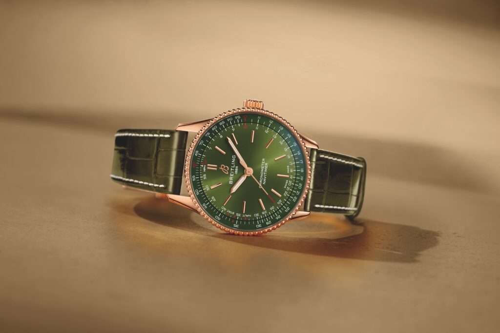 El Navitimer Automatic 36 cuenta con una esfera verde y una regla de cálculo exterior. Está equipado con el calibre Breitling 17, de indicación horaria. La caja de 36 mm se acompaña de una correa de aligátor verde y una hebilla de tipo ardillón en oro rojo.