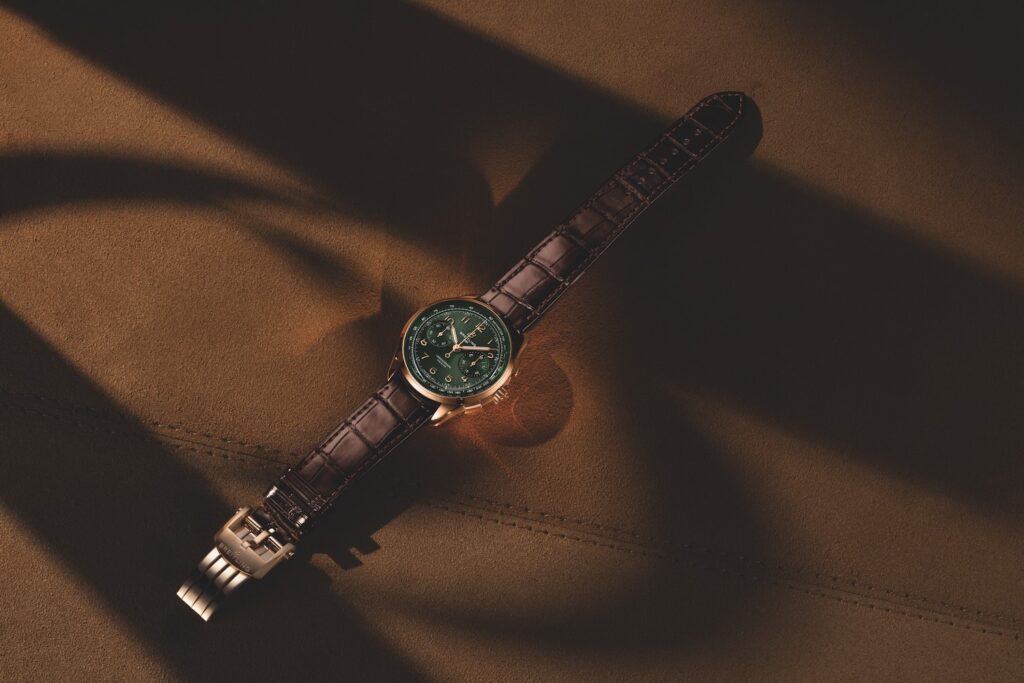 El Premier B09 Chronograph 40 funciona con el calibre de manufactura B09, de cuerda manual, que permite un perfil más delgado en una caja de 40 mm. La esfera es verde oscuro. La ausencia de rotor ofrece una vista completa del movimiento a través del cristal trasero. Incluye una correa de aligátor marrón oscuro con cierre desplegable.