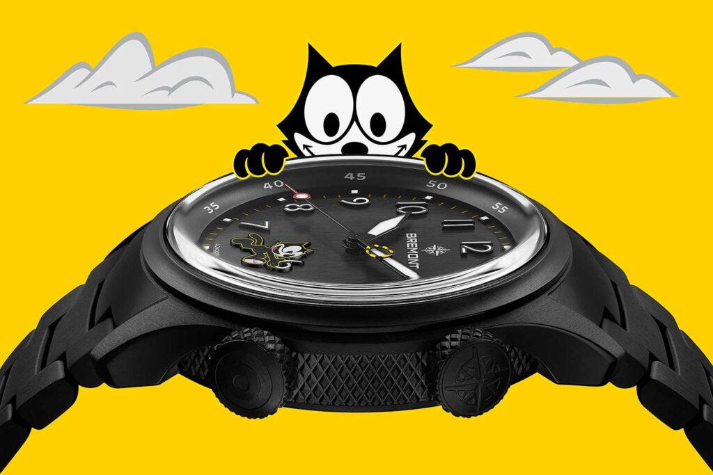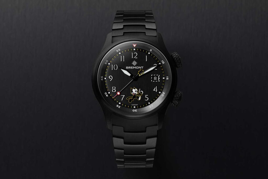 La más reciente creación de Bremont, conocida formalmente como Altitude MB Meteor Felix the Cat, es una versión completamente oscura del reloj de piloto que caracteriza a la marca, con el Felix de ojos grandes y orejas puntiagudas, ese gato tan querido.