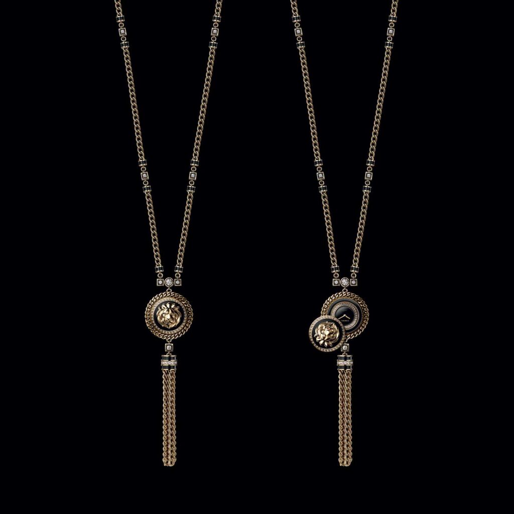 El collar largo traslada este mismo lenguaje a una dimensión más fluida y escénica. La cadena de oro amarillo, salpicada de tubos de ónix y diamantes, acompaña el movimiento del cuerpo y culmina en el botón con el león, enmarcado por un doble motivo: un círculo de diamantes y una delicada cadena perimetral. Aquí, la riqueza ornamental se amplifica con 134 diamantes en total y un juego de proporciones que enfatiza la verticalidad y el ritmo del conjunto. El pompon final, también engastado, aporta dinamismo y refuerza la vocación joyera de la pieza.