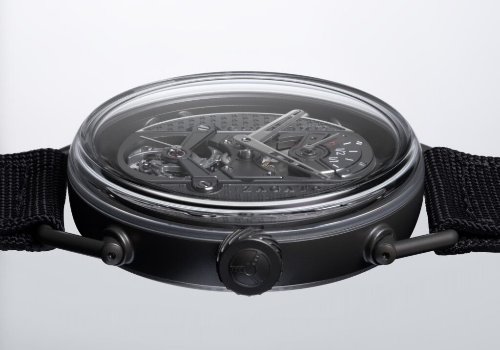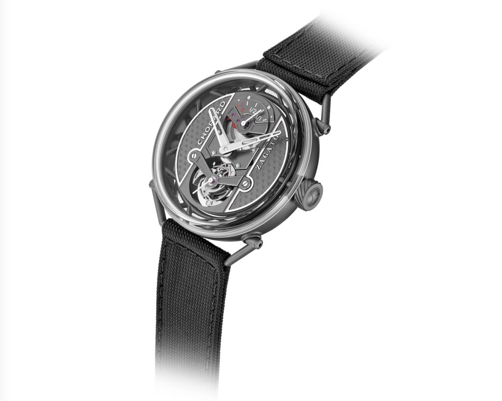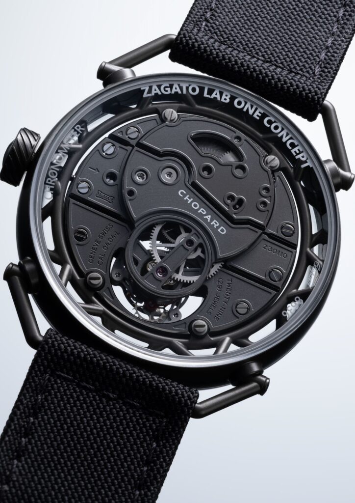 El reloj, denominado Zagato Lab One Concept, pesa 43.20 gramos con correa. Sin ella, 36.5 gramos. Es el reloj de titanio con menor peso que ha fabricado Chopard hasta la fecha. El mérito corresponde en gran parte al titanio ceramizado, un material que se obtiene mediante oxidación por tecnología de electroplasma y que alcanza una dureza de 1,000 Vickers. La caja mide 42 mm de diámetro y, junto a los puentes y la platina del movimiento, está mecanizada en este mismo material, de color gris antracita.