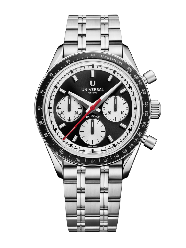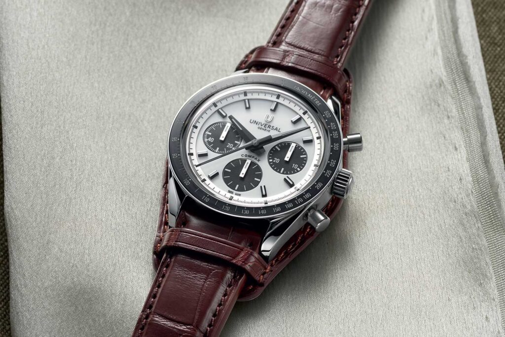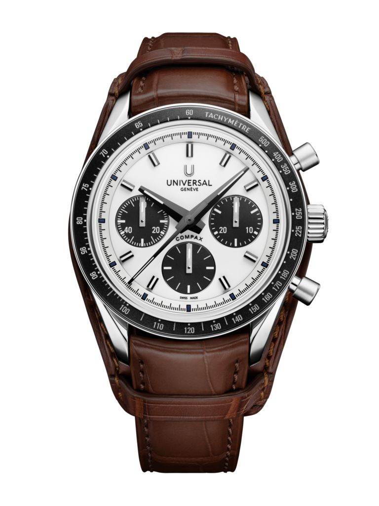 Al igual que el Polerouter, el Compax es uno de los relojes más icónicos de Universal Genève. En el camino hacia el relanzamiento, la marca lanzó el año pasado una edición limitada de tributo al Compax con el calibre de cuerda manual 281 de la famosa serie de movimientos 28x que había impulsado muchos de sus relojes Compax y Tri-Compax. También se mantuvo fiel al diseño original con la distintiva esfera panda en blanco y negro, conocida simplemente como “The Nina”, acompañada de una versión a medida de su característica correa bund de piel estilo puño.