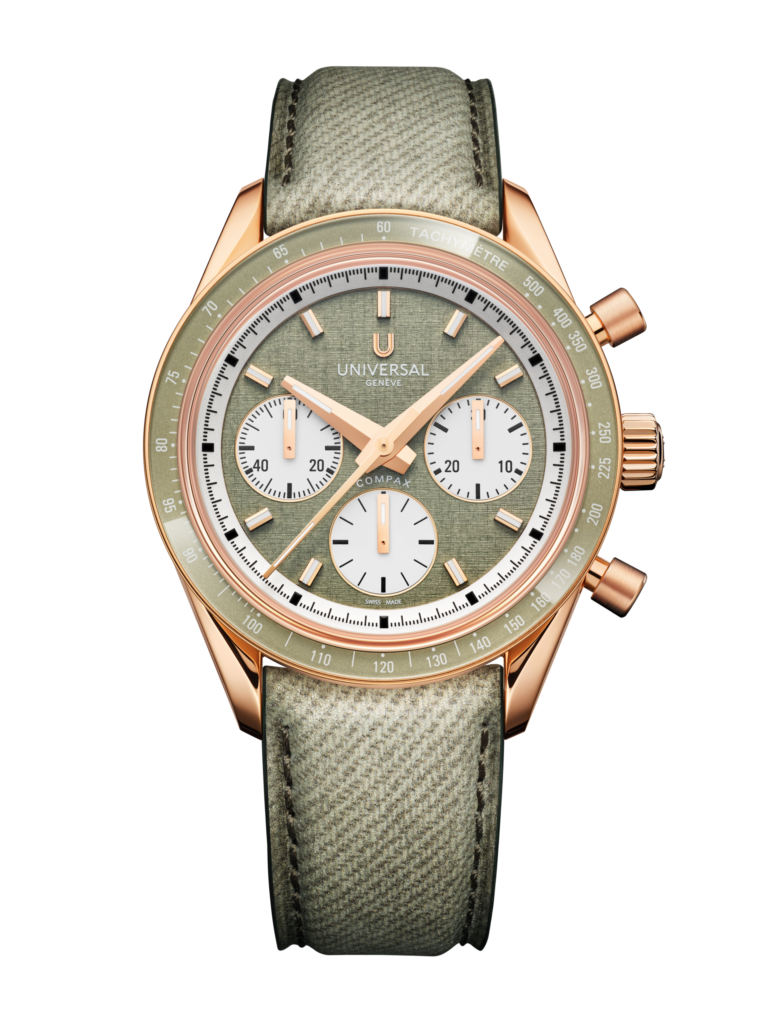 En la práctica, esto se traduce en una versión fiel al Compax de mediados de siglo de Rindt con algunas actualizaciones. Por ejemplo, mientras que el original era un reloj de dimensiones relativamente contenidas en 36.5 mm con índices impresos, plots de luminiscencia de tritio y un bisel de metal con inserto impreso, el nuevo Compax tiene una presencia en la muñeca considerablemente mayor en 39.5 mm, con índices aplicados rellenos de Super-LumiNova y un inserto de cerámica en el bisel. Mientras que el original era de cuerda manual, impulsado nada menos que por el legendario movimiento Valjoux 72, las versiones de 2026 son automáticas. Las impulsa el nuevo calibre UG-200 con el Microtor integrado de manufactura de Universal Genève y un cronógrafo de rueda de columna con embrague vertical, un guiño a dos de los sellos de identidad de la marca: el micro-rotor y el cronógrafo.