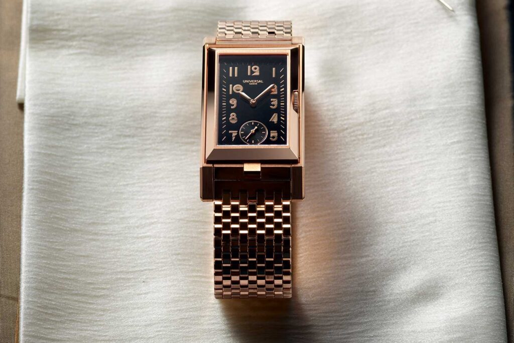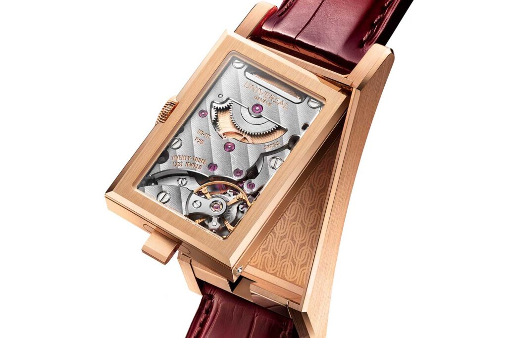 La caja ha sido modificada para que el reverso sea ligeramente cóncavo, lo que permite un mejor asiento en la muñeca. Por lo demás, la construcción histórica con el mecanismo de bisagra para la caja reversible se mantiene, con un pulsador integrado en la caja a las 6 en punto. Tanto la caja interior como el marco exterior presentan acabados cepillados y pulidos para un contraste visual muy logrado. El interior del marco exterior también está decorado con el logotipo entrelazado de Universal Genève, que refuerza la estética Art Decó del reloj.