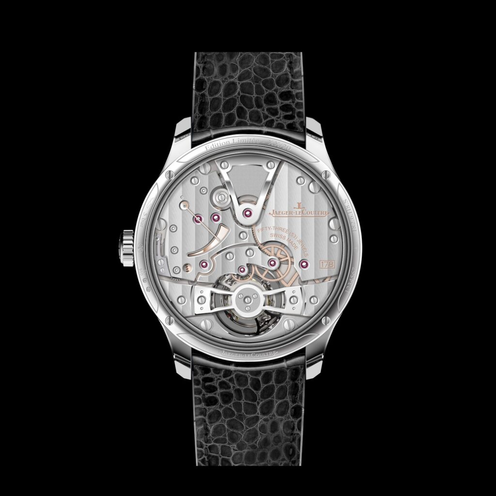 Suspendido en el vacío, el tourbillon volante de un minuto añade una dimensión visual y técnica fascinante. Sin puente superior, su ligereza estructural —apenas 0.248 gramos— no solo optimiza el espacio, sino que revela por completo el latido del órgano regulador. La espiral en forma de S, patentada por JLC, garantiza un desarrollo concéntrico que preserva la precisión incluso en un calibre tan estilizado.