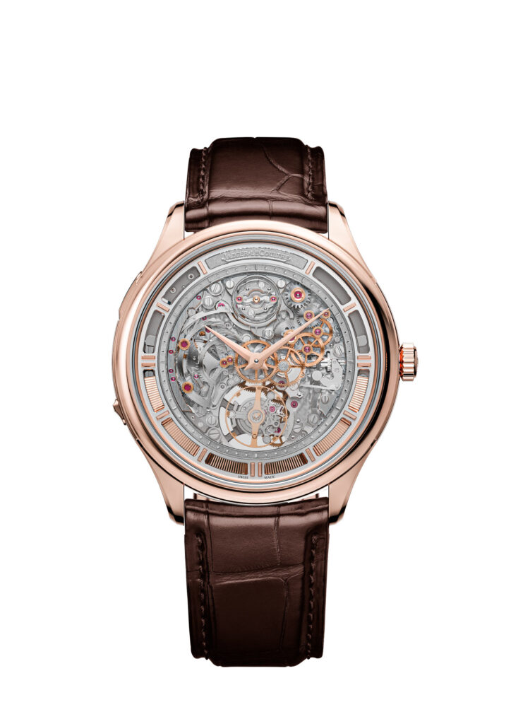 Esta sublime pieza de interminable nombre es otra obra donde la técnica se vuelve susurro. En su caja de oro rosa de apenas 8.25 mm de grosor, la Maison logra un equilibrio casi imposible: reunir un repetidor de minutos y un tourbillon volante en un movimiento automático que parece desafiar las leyes físicas, pero que, en realidad, obedece a décadas de obsesión por la precisión y la pureza acústica.