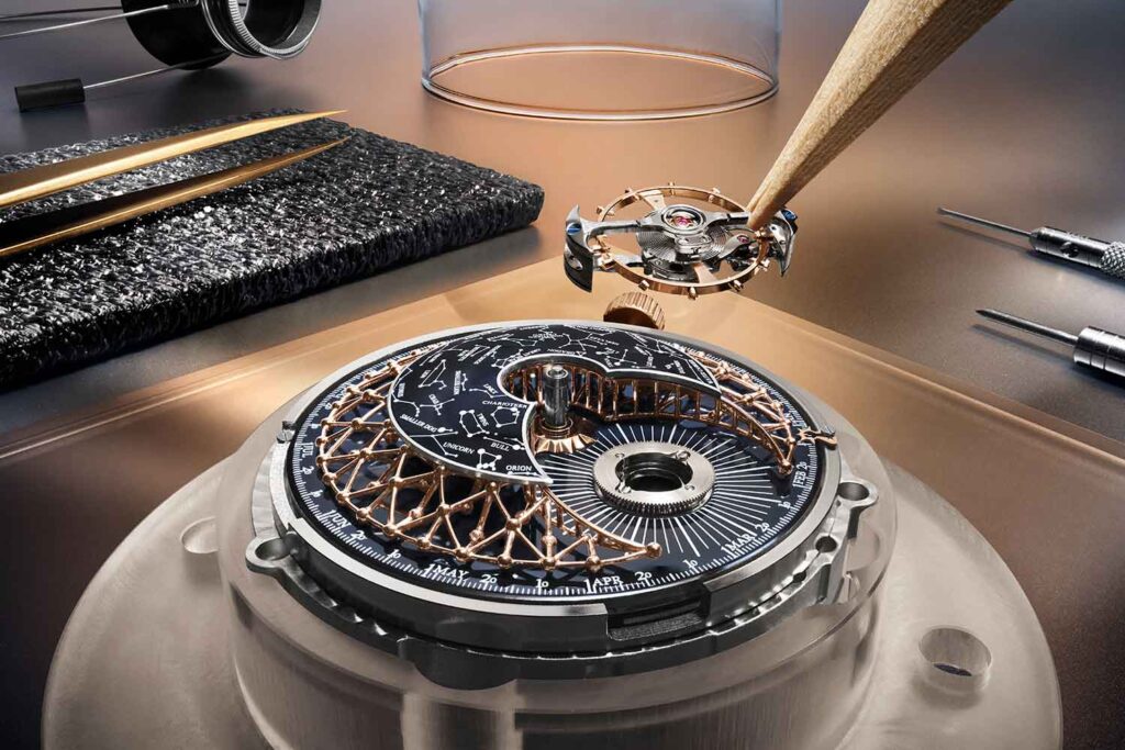 Entonces, ¿qué tipo de complicación, o combinación de complicaciones, sigue siendo desconocida para la mayoría? Esa sería la indicación de elementos astronómicos, explorada solo por un puñado de marcas y, aún así, a menudo en números muy limitados. Aquí es cuando entra en escena el Jaeger-LeCoultre Master Hybris Artistica Calibre 945, una edición limitada de cinco piezas que reúne una indicación celeste, tourbillon, repetidor de minutos, esmalte en la esfera y más.