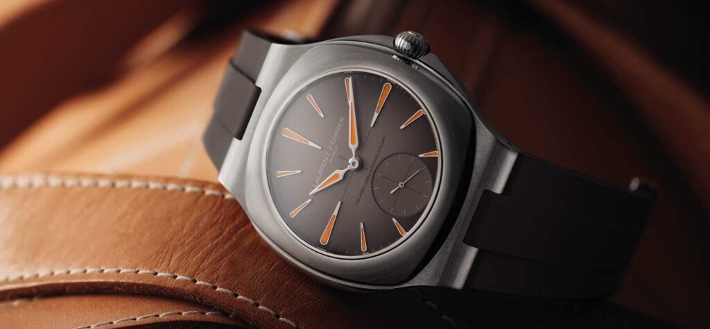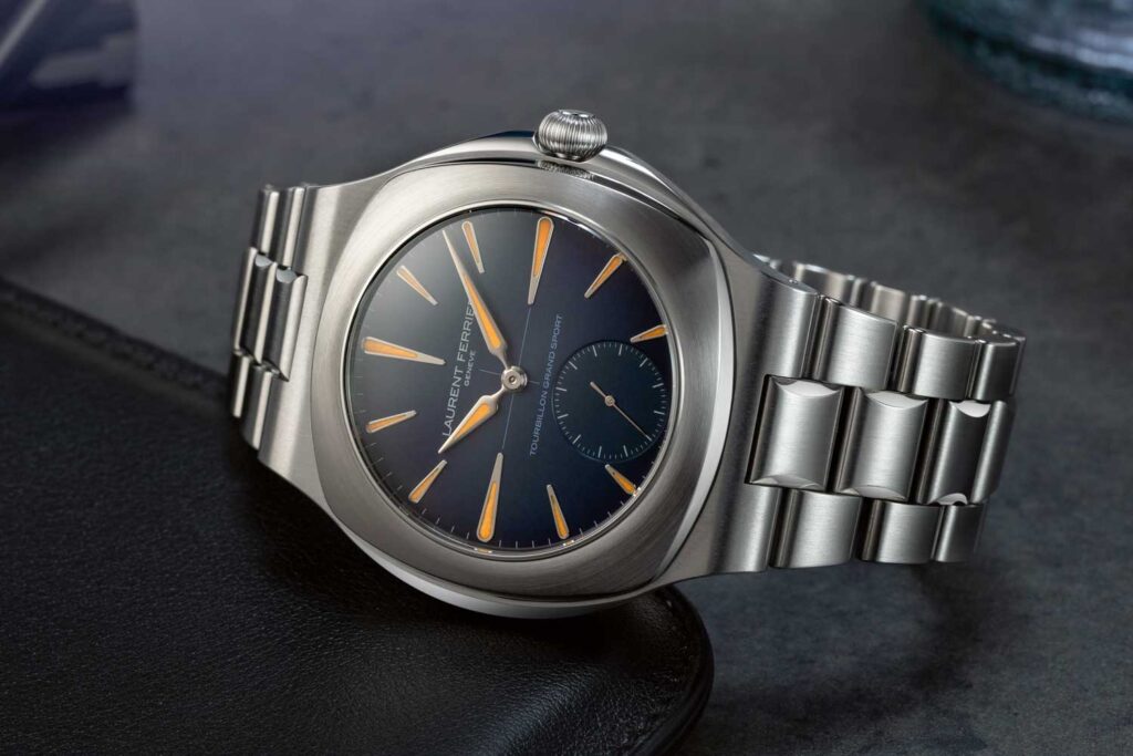 La herencia automovilística de la marca tomó forma tangible por primera vez en 2019 con el lanzamiento del Grand Sport Tourbillon. Con su caja tonneau, correa de caucho, y agujas e índices luminiscentes, era un reloj genuinamente deportivo y la primera vez que la marca reconocía sus raíces en el motor. A pesar de sus proporciones más robustas, el Grand Sport Tourbillon conservaba claros vínculos visuales con el clásico Galet Square, lo que fue una señal tranquilizadora de coherencia en el lenguaje de diseño de Laurent Ferrier.