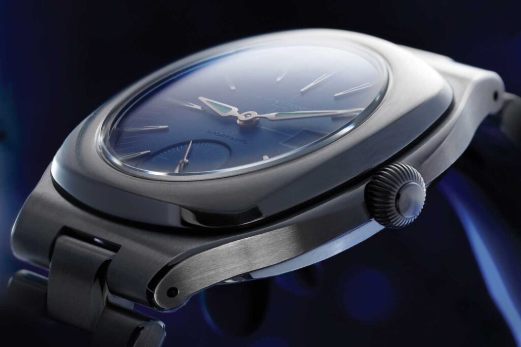 Gran parte de esa distinción proviene de su lenguaje de diseño, un enfoque sutil pero original que traza un nuevo camino para los relojes deportivos de brazalete integrado. La caja es suave y flexible en lugar de angulosa, lo que le confiere una presencia distintiva en la muñeca. A pesar de tener unos 12 mm de grosor, que es más que la mayoría de los relojes deportivos de brazalete integrado de alta gama, resulta sorprendentemente equilibrado y cómodo, demostrando que un reloj deportivo de brazalete integrado puede triunfar sin seguir la fórmula convencional de ser delgado y anguloso. Esto es posible porque el reloj está fabricado íntegramente en titanio ligero en lugar del acero más típico, lo que le permite tener presencia visual sin resultar incómodo.