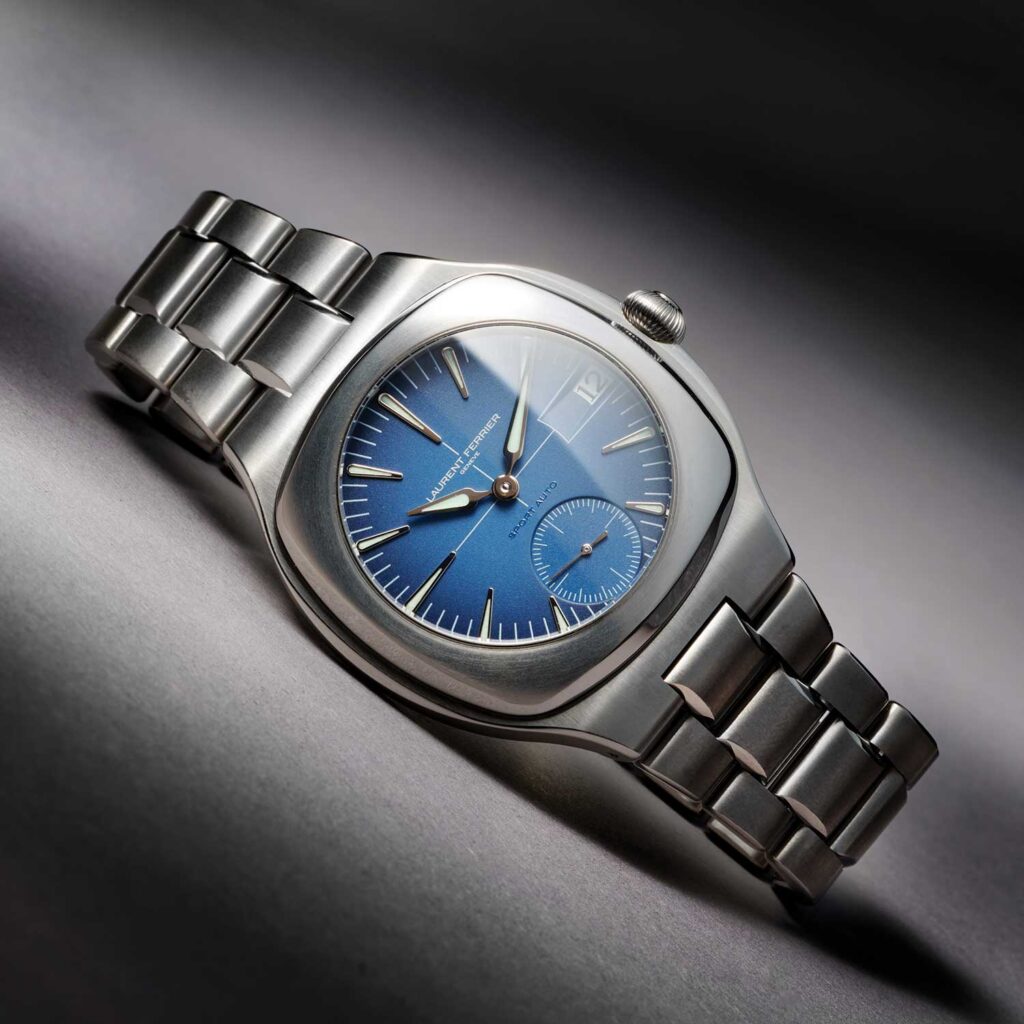 En 2020, el Grand Sport Tourbillon se equipó con un brazalete integrado, algo que Laurent Ferrier no había ofrecido anteriormente. Sin embargo, como suele ser el caso con los relojes deportivos de brazalete integrado, los coleccionistas esperaban algo más sencillo y contenido. Esa dirección se materializó plenamente en 2022 con la introducción del Sport Auto. Concebido como una evolución del Grand Sport más que como una ruptura con él, el reloj prescindió del tourbillon en favor de una visualización de solo la hora y adoptó dimensiones más compactas. Con 41,5 mm de ancho y 12,25 mm de grosor, era más pequeño y delgado y, en consecuencia, más llevadero y cómodo que el Grand Sport original de 44 mm.