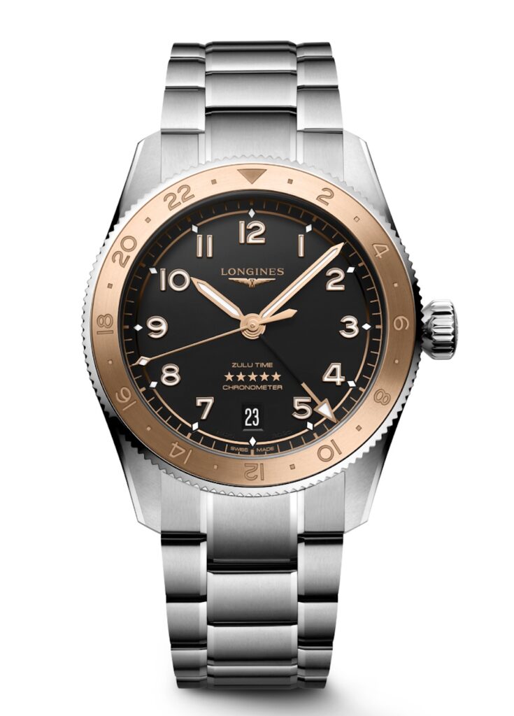 Elaborado para conmemorar el centenario del primer reloj de pulsera Longines con doble huso horario de 1925, este distintivo modelo presenta una caja de 39 mm con una hermeticidad de hasta 100 metros y un bisel giratorio bidireccional con inserto de de oro rosa. Funciona con el calibre Longines L844.4 automático con certificación COSC y funcionalidad GMT.