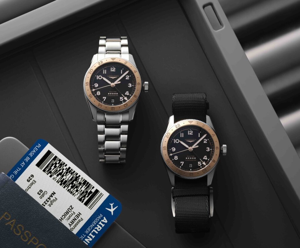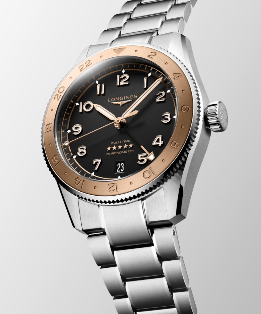 Perteneciente a la familia Spirit, esta colección toma su inspiración del primer reloj de pulso con doble huso horario del mundo, de 1925. Alojado en una caja de 42 mm resistente al agua hasta 100 m, cuenta con un bisel giratorio bidireccional con inserto de cerámica. Lleva el calibre L844.4 con función GMT y grado COSC.