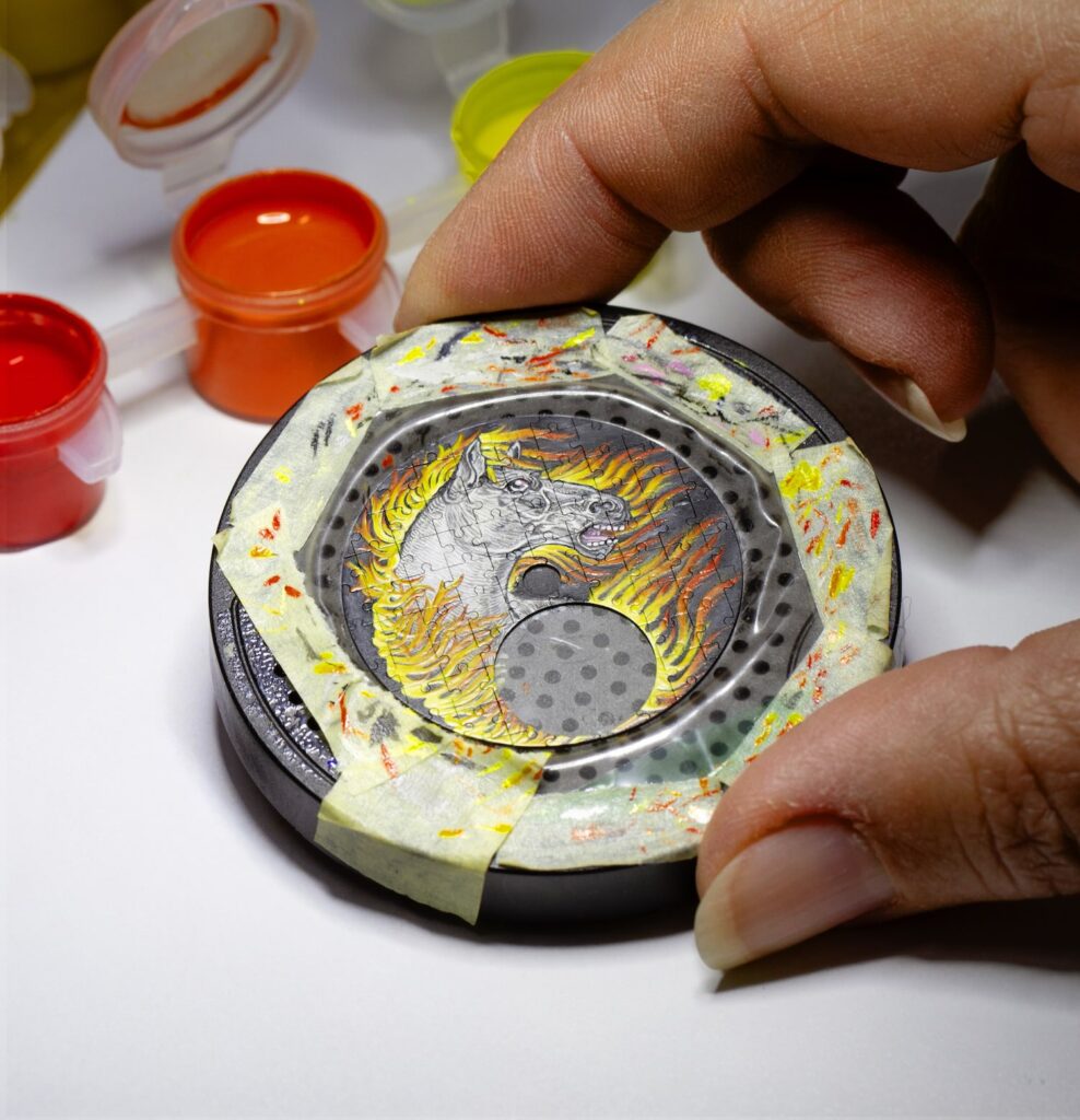 La esencia de este signo se materializa en la esfera a través de la técnica del dial puzzle. Un caballo en movimiento, con la cabeza elevada y la crin representada como llamas estilizadas, se recrea mediante micro pintura a mano. Esta composición artística se ejecuta sobre un rompecabezas de 81 piezas independientes de titanio, ensambladas en cuatro niveles. El proceso requiere desmontar la estructura completa, pintar el canto de cada pieza y volver a ensamblarla con precisión para lograr la imagen final.