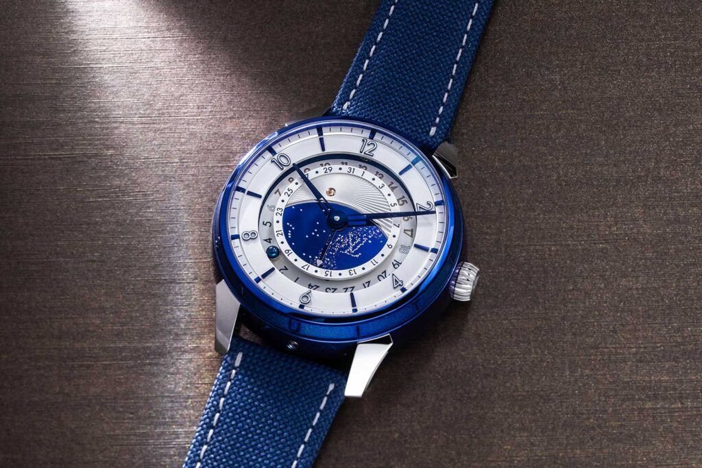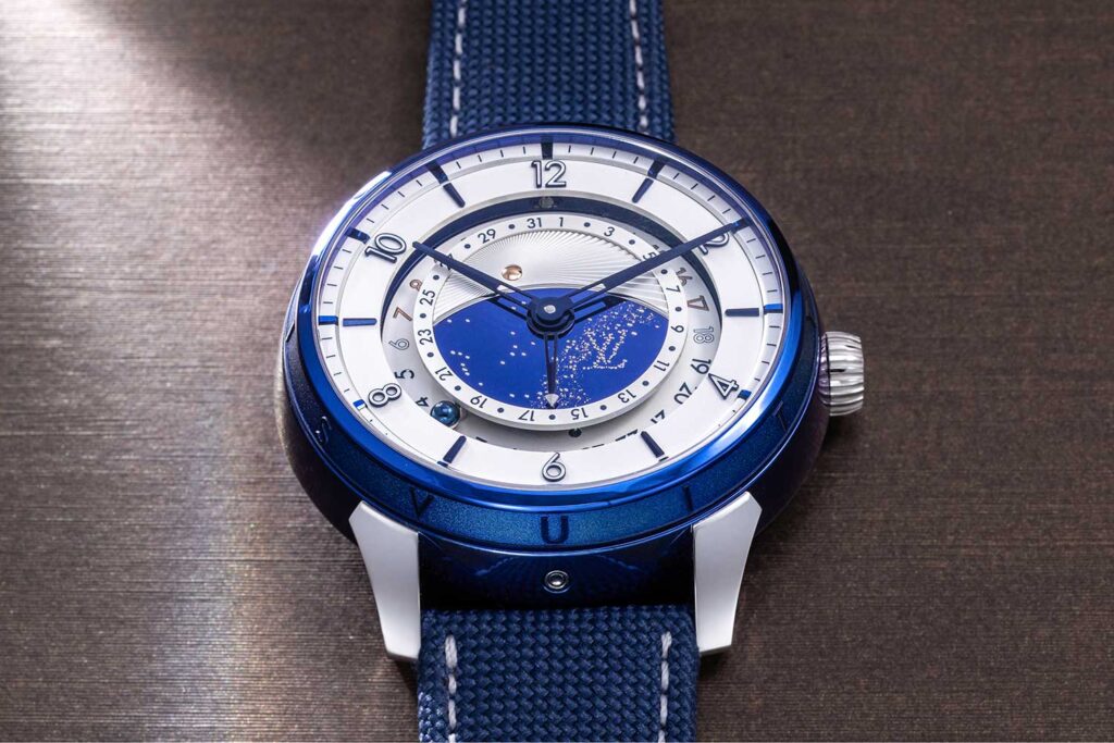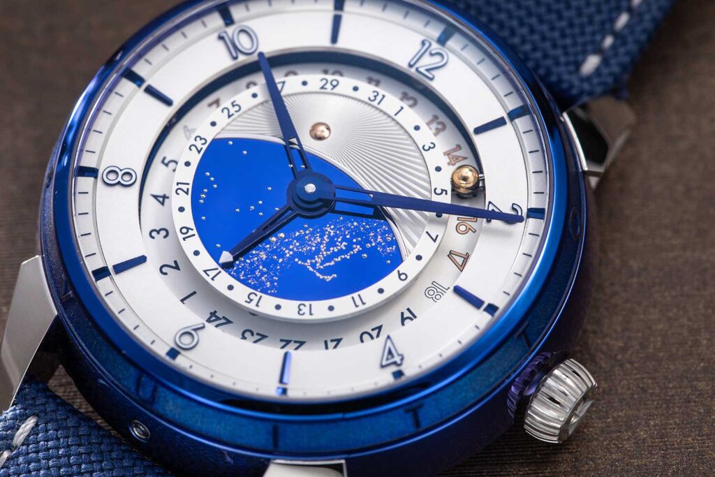 En cuanto al arte, la base del reloj de titanio está incrustada con una marquetería de meteorito. El meteorito utilizado tiene más de un millón de años. Subiendo, la forma del reloj recuerda, por supuesto, al modelo Tambour de Louis Vuitton con su impresionante diorama en el flanco de la caja. La esfera del reloj presenta los índices Tambour característicos de Louis Vuitton. El globo dorado, o el reloj, dependiendo de si está insertado en la cápsula o no, está rodeado por un cielo de titanio azulado a la llama con estrellas de oro.