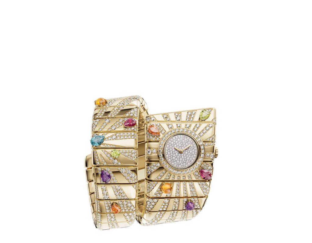 Tubogas Manchette es una celebración exuberante de la feminidad y del espíritu audaz de los años setenta. Inspirada en un modelo de 1974, retoma la poderosa geometría del brazalete Tubogas de una sola espira y la combina con una caja cuadrada que actúa como punto focal. El oro amarillo se ilumina con una vibrante paleta de gemas —citrinos, rubelitas, peridotos, amatistas, topacios y espesartitas—, acompañadas de cerca de doce quilates de diamantes que recorren la superficie con un brillo rítmico y sensual. No sobra recordar que este diseño sirvió de base para el reloj-joya que Bvlgari creó en honor a Frida Kahlo el año pasado.