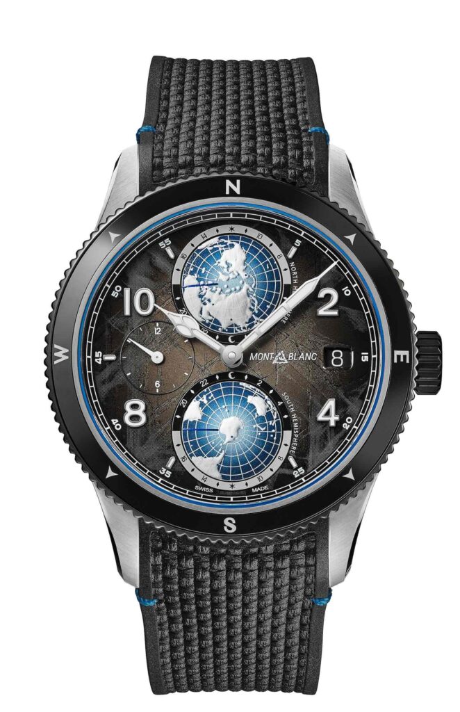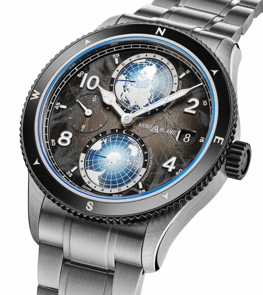 El modelo base no es nuevo. El Geosphere existe desde 2019 y su propuesta central es la visualización de todas las zonas horarias del mundo a través de dos globos terráqueos giratorios —hemisferio norte y sur— con los ocho picos más altos de cada continente marcados en azul oscuro, más la cima del Mont Blanc. A eso se suma un indicador de día/noche, escala de 24 horas, segunda zona horaria y fecha. El movimiento es el calibre automático MB 29.25, manufactura propia.