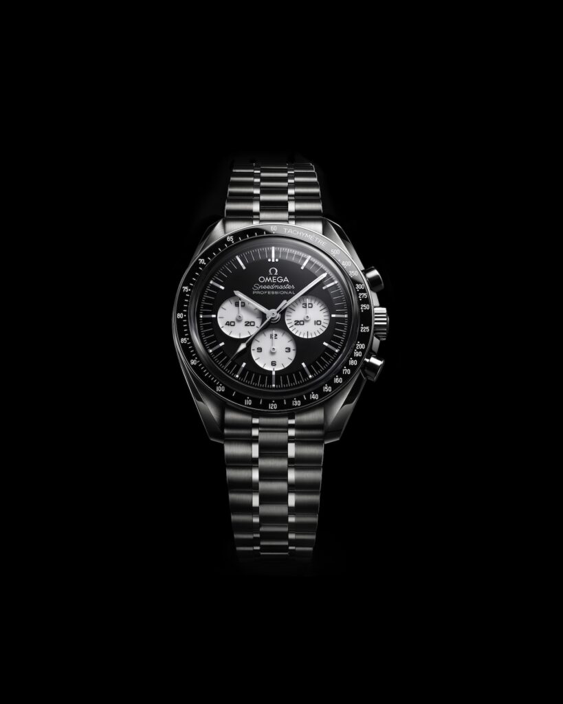 Este juego de inversión cromática no es un simple recurso visual. Cada detalle está pensado para reforzar la legibilidad y la coherencia estética: la minutería del dial principal se imprime en blanco, mientras que las escalas de los subregistros aparecen en negro, creando una jerarquía visual clara e intuitiva. El conjunto se completa con un bisel de cerámica negra, relleno con una escala taquimétrica en esmalte blanco, un guiño contemporáneo a uno de los códigos más reconocibles del Speedmaster profesional.