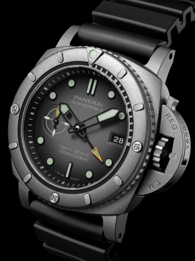Panerai presenta el Submersible Navy SEALs Afniotech™ Experience PAM01089, una edición limitada a 35 piezas. Su caja de 47 mm está fabricada en Afniotech™, un material compuesto innovador que contiene más del 95 % de hafnio. Este metal, extremadamente raro y difícil de mecanizar, ofrece una resistencia a la corrosión superior incluso que el del titanio, una densidad notable (70 % más pesado que el acero inoxidable) y un acabado arenado no reflectante, ideal para operaciones submarinas.