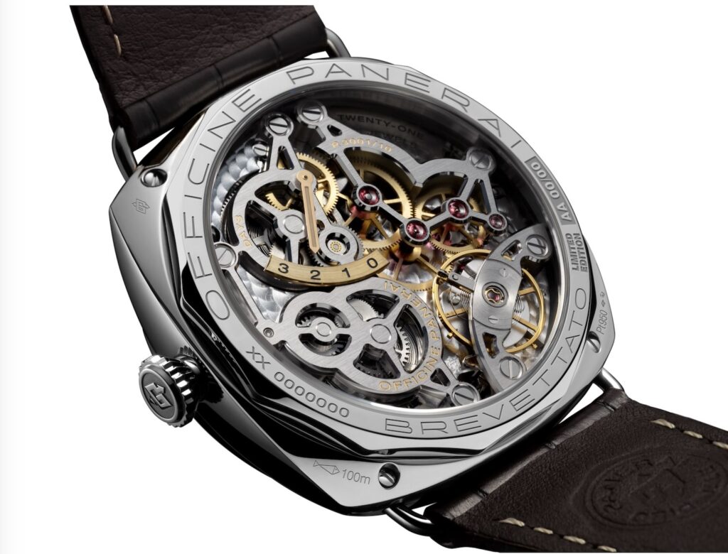 El PAM01730 emplea Platinumtech, una aleación de platino con un tratamiento que aumenta su dureza en un ochenta y cinco por ciento respecto al platino estándar. La carátula negra tiene un acabado cepillado circular y una construcción sándwich, con la inscripción “Radiomir Panerai” grabada en tono sobre tono. El movimiento es el calibre P.3001/10, también de cuerda manual, con puentes esqueletizados y un indicador de reserva de marcha situado en el fondo. Las agujas son igualmente de acero bruñido azul y el cristal de Plexiglas abovedado.