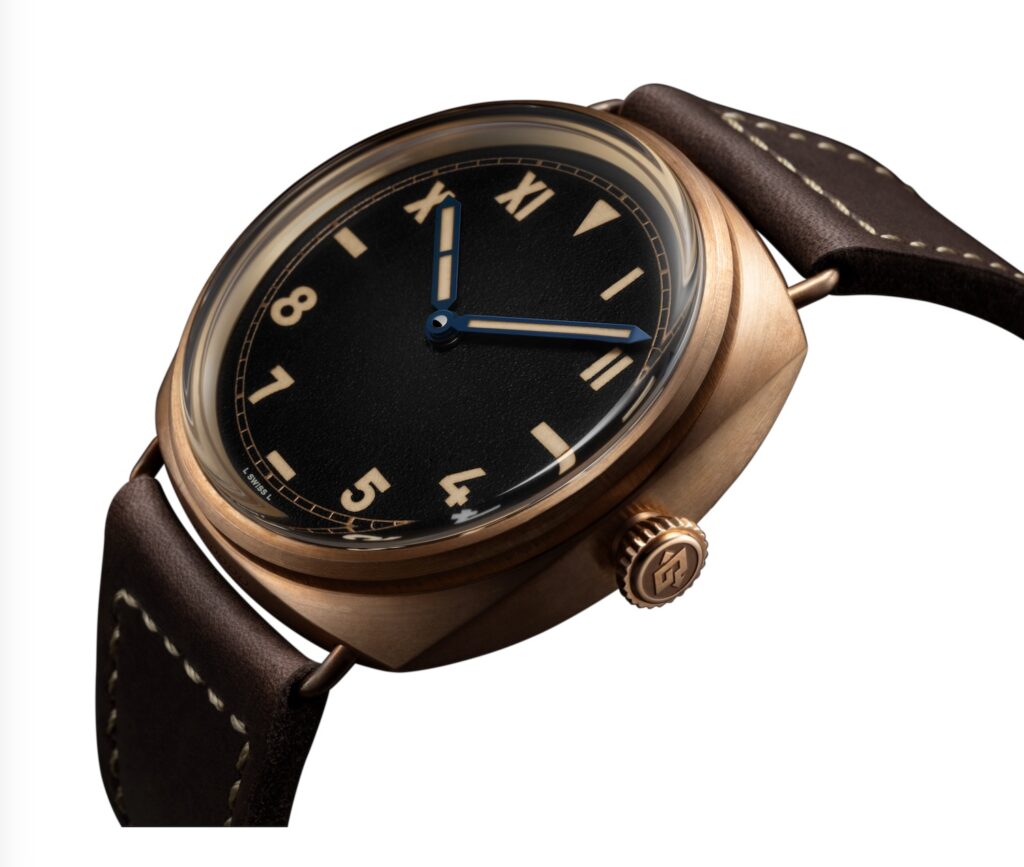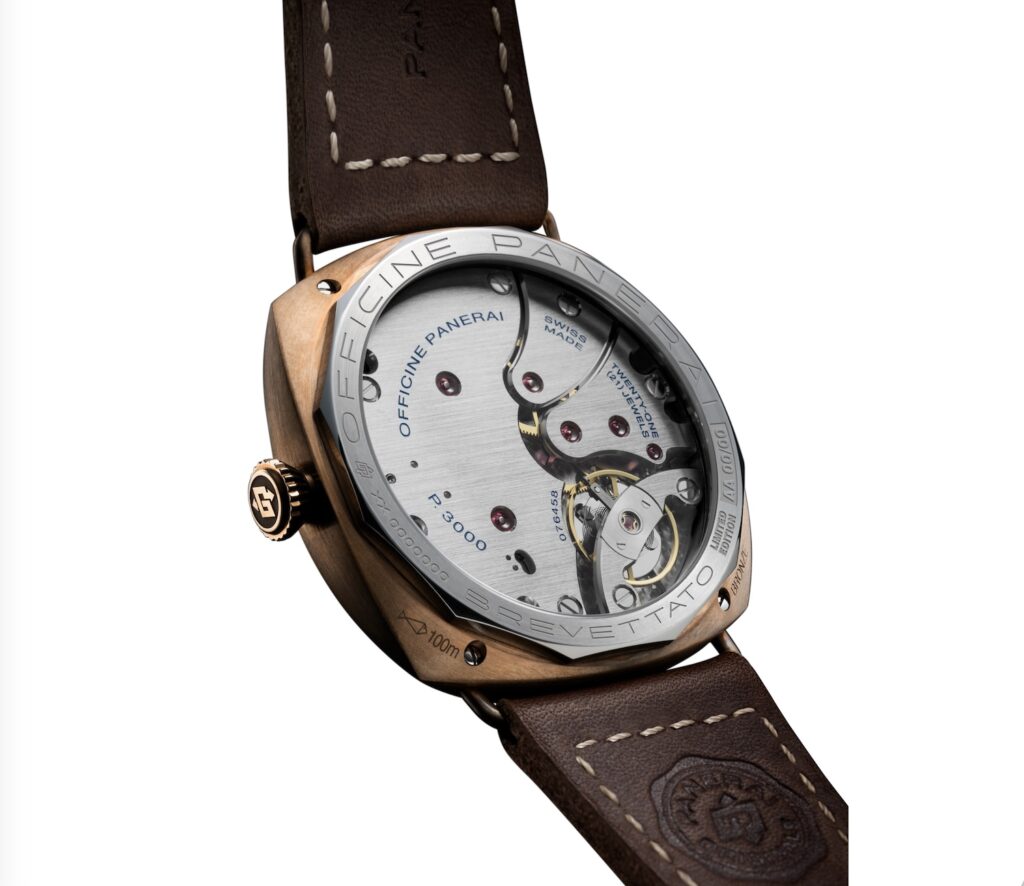 El PAM01729 presenta una caja de bronce con una aleación compuesta por cobre y estaño puros, un material que desarrolla una pátina con el paso del tiempo. La esfera combina índices romanos y arábigos en una disposición conocida como California, una configuración que los coleccionistas asocian con los primeros relojes de buceo por su legibilidad en condiciones de poca luz. Las agujas son de acero bruñido azul y el cristal es de Plexiglas abovedado. El movimiento es el calibre P.3000 de cuerda manual, con dos barriletes y una reserva de marcha de tres días. El fondo es de titanio con un cristal de zafiro que permite ver el mecanismo.