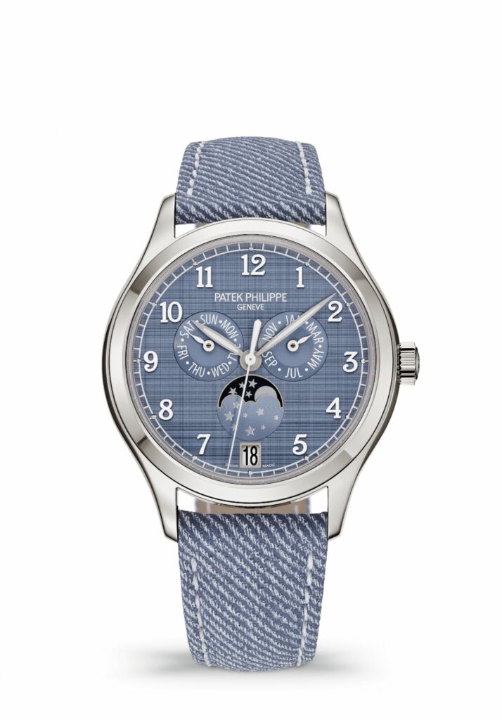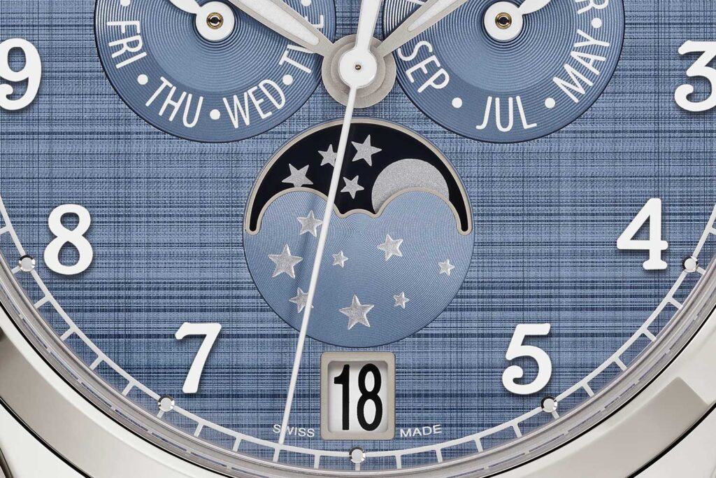 Con la nueva Ref. 4946G-001, Patek Philippe ofrece una interpretación contemporánea del calendario anual que equilibra sofisticación clásica y sensibilidad moderna. La caja de 38 mm en oro blanco totalmente pulido proyecta una elegancia sobria, realzada por una carátula azul-gris con acabado «shantung», cuya textura satinada, vertical y horizontal, evoca la seda natural. La luz no se limita a reflejarse: se desliza sobre la superficie con matices cambiantes, aportando profundidad y carácter.