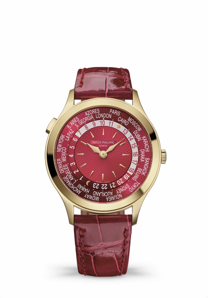 La correa de aligátor rojo carmín prolonga la intensidad cromática del conjunto, mientras el fondo de zafiro revela un movimiento acabado bajo el Sello Patek Philippe.