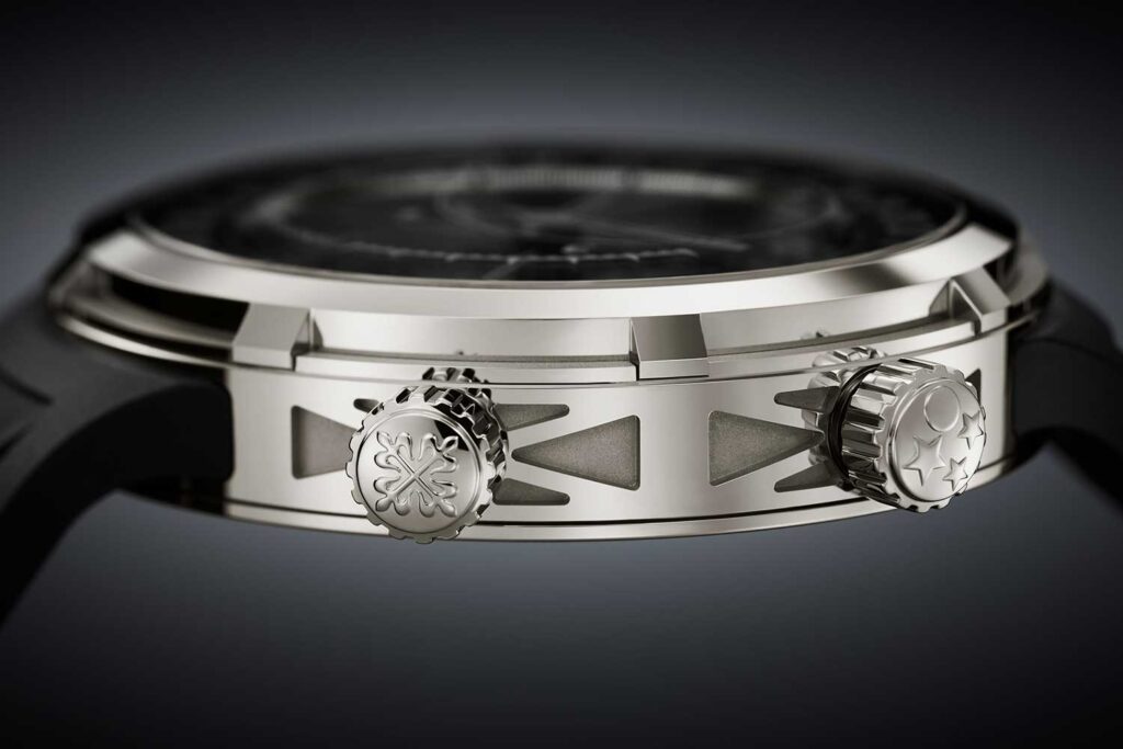 El reloj mide 47 mm de diámetro y 12.39 mm de altura; considerable sobre el papel, pero que probablemente se llevará de forma notablemente más discreta gracias a su diseño sin asas. La caja de oro blanco se aparta del formato Celestial clásico. La carrura presenta un motivo en relieve en forma de X, inspirado en las estructuras tubulares con refuerzos cruzados de los módulos espaciales. El mismo patrón continúa en el fondo de caja sólido, donde se centra en una Cruz de Calatrava. Está equipada con dos coronas: una a las 4 horas para dar cuerda y ajustar la hora, y una segunda a las 2 horas para ajustar las indicaciones astronómicas mediante un sistema de desconexión de bayoneta que evita el accionamiento accidental. Un corrector insertado en la carrura entre las 7 y las 8 horas adelanta la fecha. La transición entre el horario de verano e invierno se gestiona mediante dos pulsadores a las 9 y las 10 horas, que desplazan la hora en una unidad mientras rotan el disco de fecha sobre el que están impresas las escalas de salida y puesta del sol.
