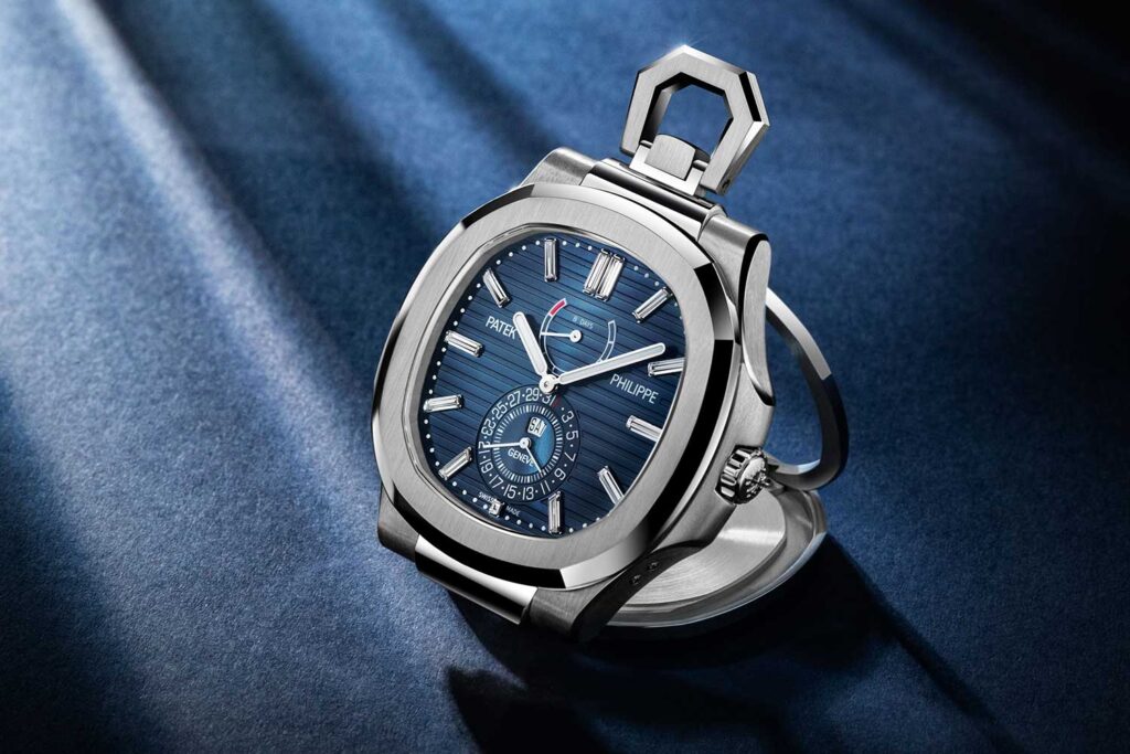 Con la Ref. 958G-001, Patek Philippe hace algo que, sobre el papel, parece improbable. Convierte el Nautilus en un reloj de bolsillo y sobremesa y, sin embargo, funciona bastante bien. Los elementos familiares están todos ahí —el bisel octagonal redondeado, las “orejas” laterales— solo que ahora expandidos a 50.65 mm de anchura, con una tapa articulada que también sirve de soporte para que el reloj se mantenga en posición vertical sobre un escritorio.