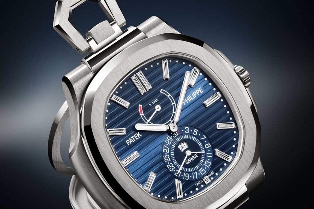 La referencia incorpora además al Nautilus un conjunto de complicaciones prácticas y discretas vistas por primera vez en el Calatrava 8-Day Ref. 5328G el año pasado, y que más de uno desearía ver en un Nautilus de pulsera. Además de horas, minutos y pequeño segundero, ofrece una indicación instantánea de día y fecha integrada en el pequeño segundero, junto a un indicador de reserva de marcha a las 12 horas. El calibre interior, el de cuerda manual 31-505 8J PS IRM CI J, es uno de los desarrollos más significativos de Patek en los últimos tiempos, con dos bariletes en serie que proporcionan una reserva de marcha de 8 días funcionando a 28,800 alternancias por hora.