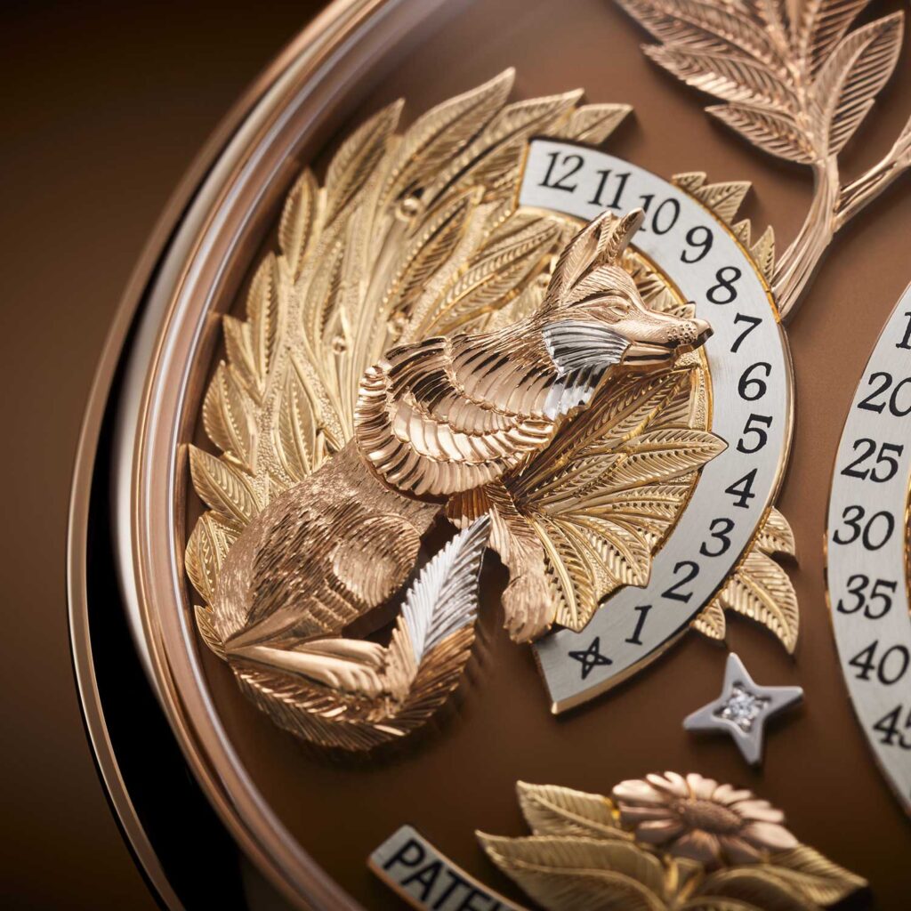 La esfera está concebida como una escena en miniatura, con 10 apliques grabados a mano en múltiples colores de oro sobre una base de oro macizo en opalina marrón. A primera vista son decorativos, pero no todos lo son únicamente. La cabeza y las patas del zorro, por ejemplo, forman parte de la indicación, y eso cambia por completo los términos del ejercicio. El material es delgado de por sí, llegando hasta 0.2 mm en sus puntos más finos, y cualquier presión excesiva corre el riesgo de alterar la geometría lo suficiente como para afectar el funcionamiento del reloj. Llevar la esfera a su estado final exige alrededor de 150 horas de trabajo manual.
