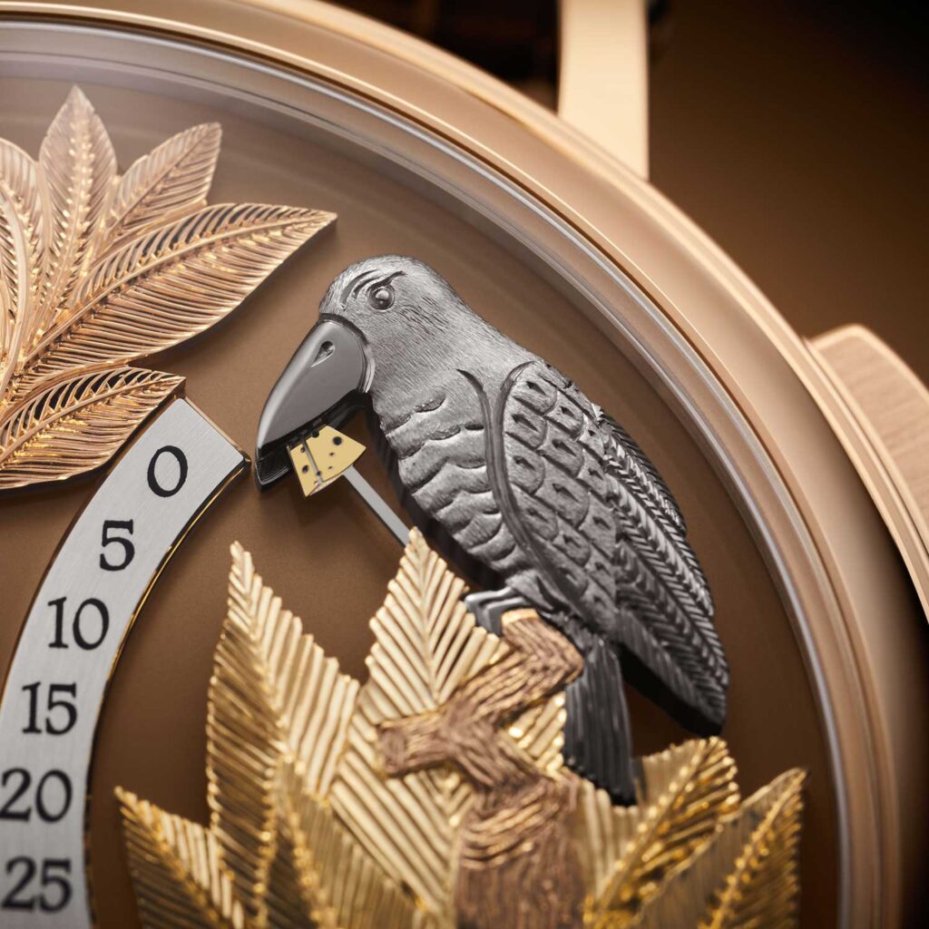 Patek Philippe ha presentado también algo bastante inesperado en el contexto de su producción moderna: su primer reloj autómata de pulsera, la Ref. 5249R-001. En esencia, es un reloj que indica la hora únicamente a demanda, y lo hace como una breve actuación mecánica inspirada en El cuervo y el zorro, de La Fontaine. Al presionar el pulsador de las 2 horas se desencadena la secuencia. Primero, el zorro indica las horas, usando su pata para las horas bajas y su cabeza para las superiores. Si se mantiene presionado, llega la segunda parte: una aguja retrógrada de minutos, con forma de trozo de queso, cae del pico del cuervo y recorre un arco de 60 minutos. Al soltar el pulsador, ambas indicaciones regresan al instante a sus posiciones de reposo, dejando la esfera nuevamente como un tableau estático.