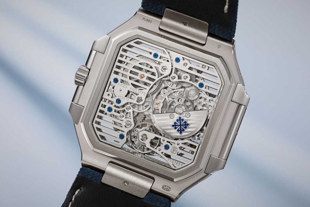 El movimiento está ejecutado casi en su totalidad en rodio, incluyendo las platinas, los puentes, las ruedas e incluso el microrrotor, interrumpido únicamente por los tornillos azulados al calor y la Cruz de Calatrava grabada. Incluso los rubíes son sustituidos por zafiro transparente, reforzando el efecto monocromático. Todo ello confiere al calibre un carácter marcadamente moderno, que encaja cómodamente dentro del lenguaje de diseño más nítido y asertivo del Cubitus.