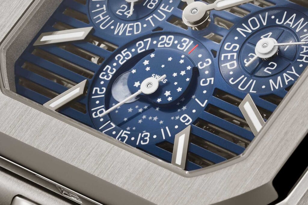 La indicación está compuesta por dos discos de vidrio mineral ultrafinos: uno forma el cielo nocturno, con estrellas grabadas y metalizadas sobre un fondo barnizado en azul, mientras que el otro, incrustado en él, lleva la luna propiamente dicha. Esta última está acabada con metalización negra y estructuración láser para reproducir la superficie lunar. El efecto es notablemente más evocador e indudablemente hermoso.