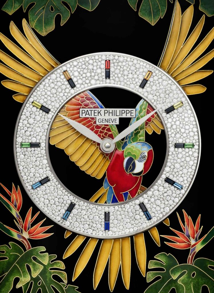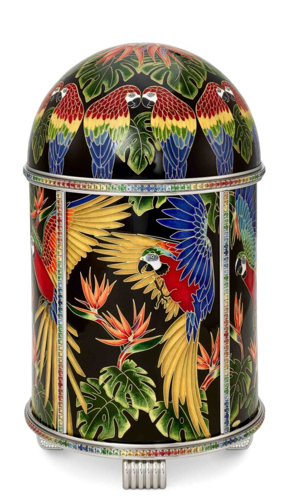 Entre las piezas destacadas, sobresale el reloj de mesa tipo domo Ref. 22000M-001 «Macaws», el primero de la casa que incorpora un engaste de piedras preciosas. Realizado en esmalte cloisonné con pintura en miniatura, representa un vibrante escenario amazónico en el que guacamayas multicolores cobran vida. La complejidad técnica es apabullante: más de 20 metros de hilo de oro delimitan las figuras, mientras que una paleta de 48 colores de esmalte y múltiples cocciones a muy altas temperaturas generan profundidad y matices. El conjunto se enriquece con un espectacular engaste de diamantes y piedras de color que refuerzan el dinamismo visual.
