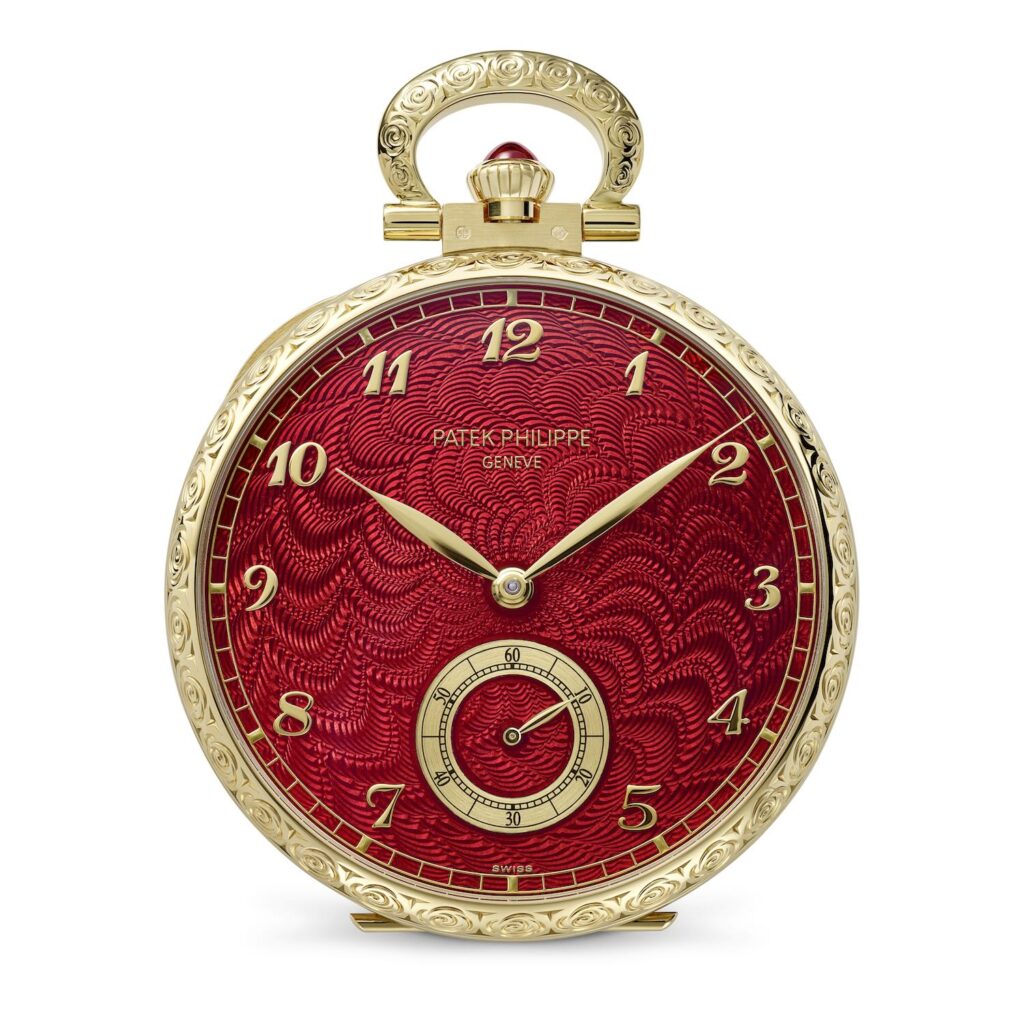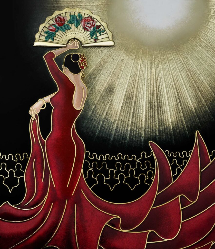 Otra pieza destacable es el reloj de bolsillo Ref. 992/198J-001 «Flamenco», que captura a una bailaora en pleno movimiento. Aquí, la combinación de esmalte cloisonné y flinqué, de pintura en miniatura y de grabado a mano crea una escena cargada de intensidad. El fondo trabajado en guilloché, visible a través de esmalte translúcido, aporta luminosidad, mientras que los detalles —como el abanico pintado o el bisel grabado— evidencian un control absoluto de las técnicas.