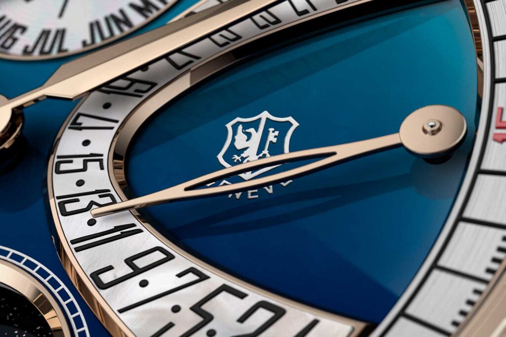 La estética de Dubuis siempre ha tendido hacia la profundidad y la dramaturgia, y el Hommage La Placide continúa esa tradición con una construcción de esfera de cinco niveles. La virola exterior, cepillada circularmente y rodiada, crea un halo metálico. Debajo, los segmentos del calendario y los contadores brillan en nácar, mientras que la platina principal, acabada en azul Leman —un guiño al lago—, proporciona un profundo y grato contraste visual. La fase lunar se sitúa en el nivel más profundo, su disco de aventurina azul salpicado de lunas curvas de oro amarillo que brillan como dos crecientes sobre Vevey al anochecer.