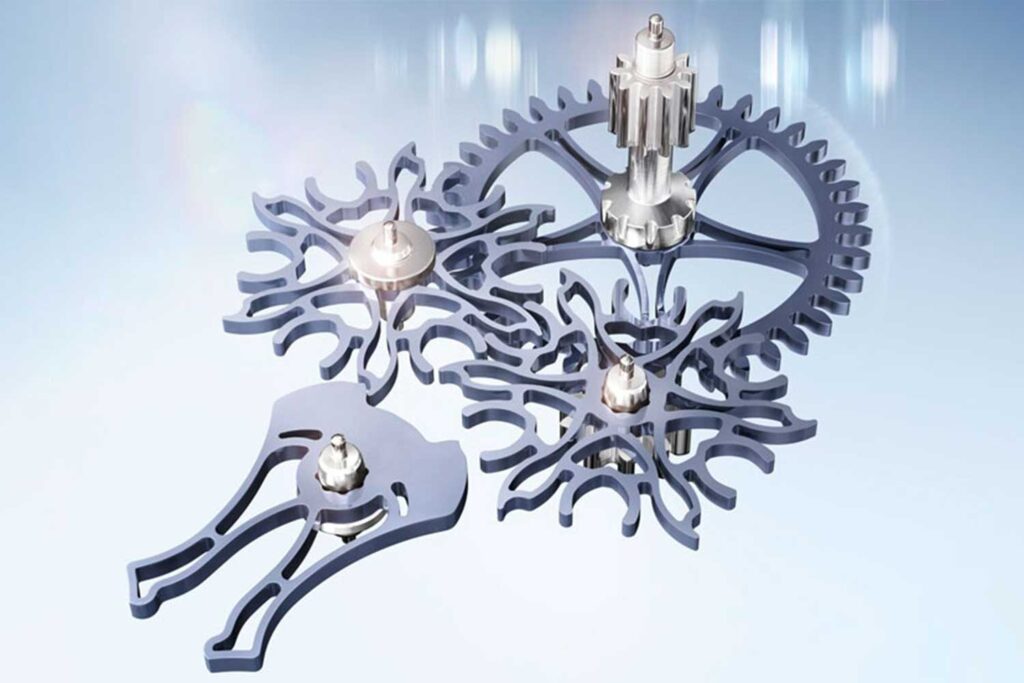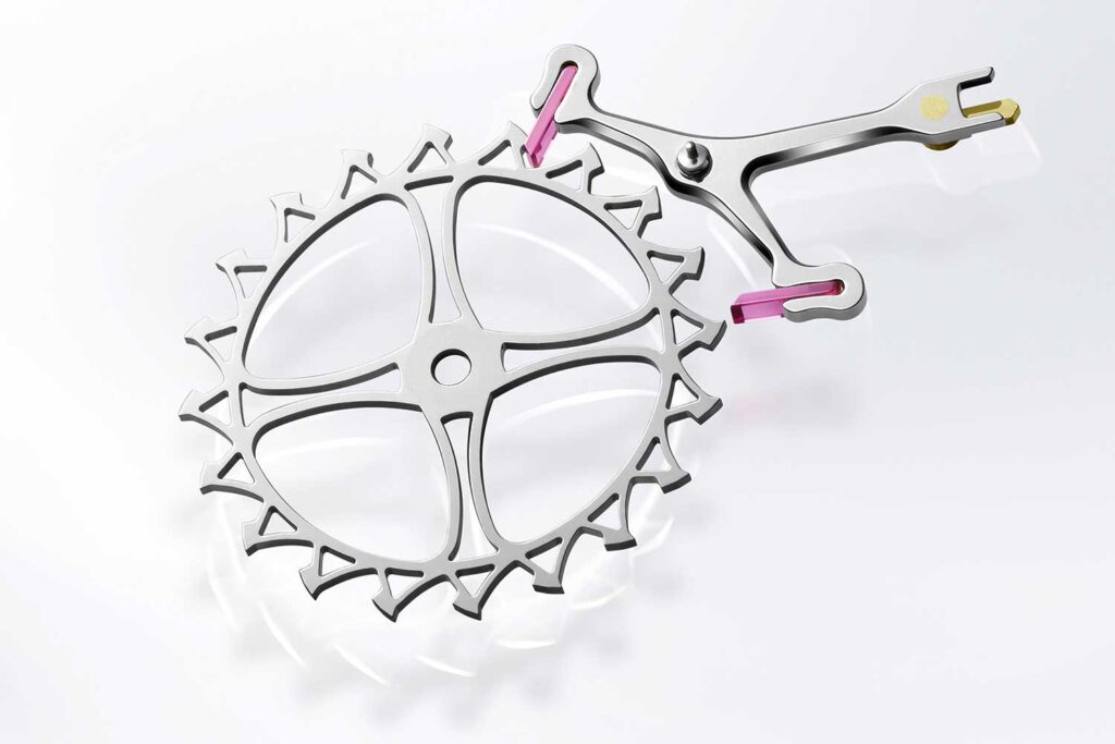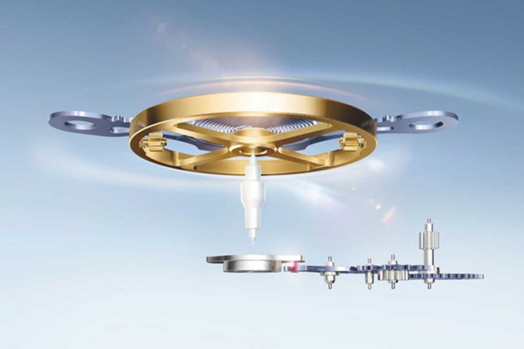 El eje del volante está hecho de cerámica conformada por láser de femtosegundo y pulida a un acabado nanométrico, lo que le da superficies de rodamiento perfectamente lisas, duras, no magnéticas y de baja fricción. El amortiguador de choques Paraflex también se ha optimizado, adoptando una geometría interna de doble cono que centra axialmente la piedra de capa y el resorte. Emparejado con un resorte de lámina mejorado y de menor rigidez, mantiene una precarga más constante sobre la piedra de extremo, de modo que los pivotes de cerámica experimentan menos carga puntual y regresan al centro de manera suave y predecible tras un impacto. Finalmente, el espiral Syloxi se rediseñó para 5 Hz, con una rigidez efectiva aumentada.
